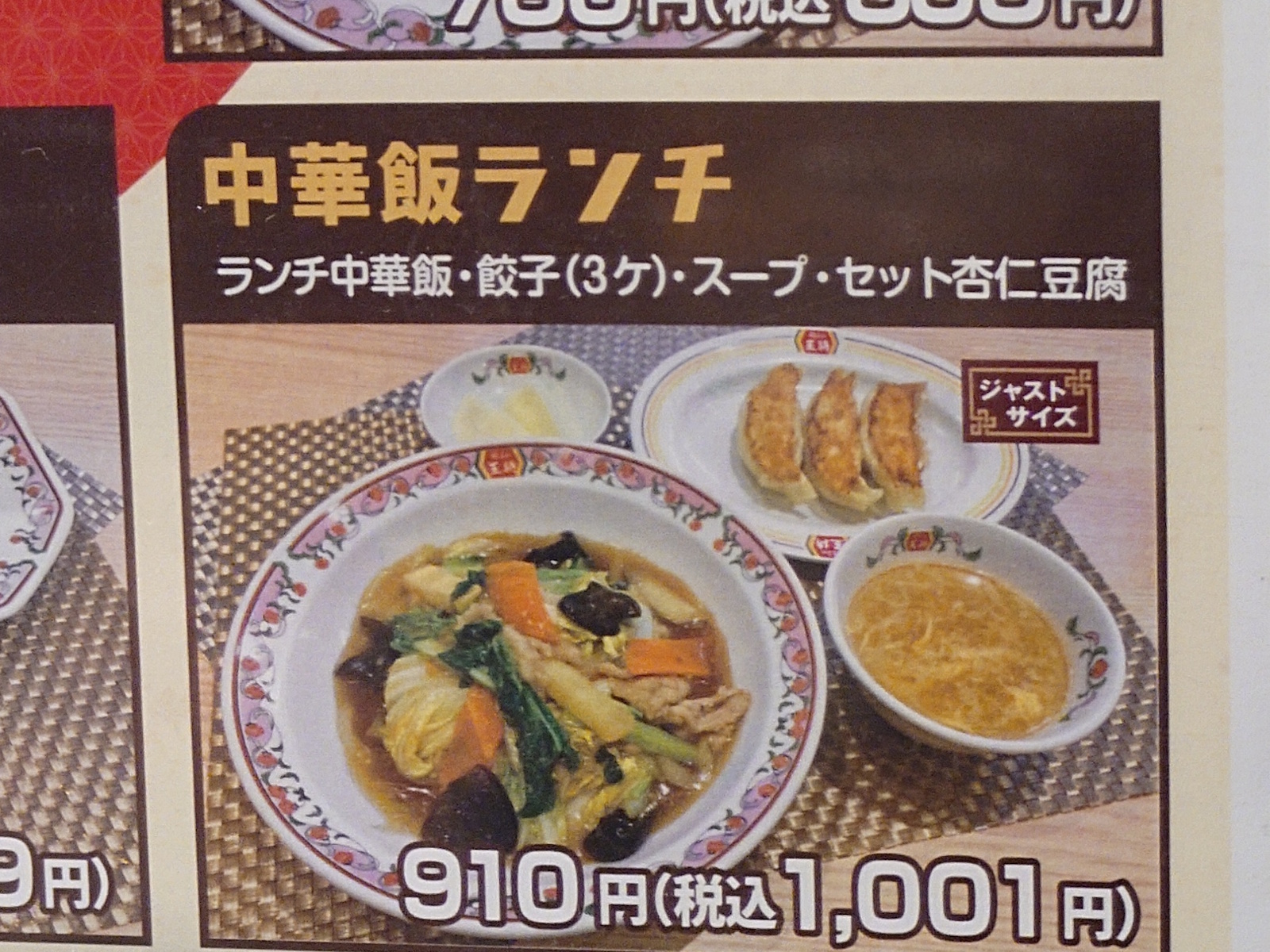 前述の中華飯 (確かスープ付き) + 餃子 (ジャストサイズ) に杏仁豆腐を加えて単純計算だと計 1,138 円になる組合せが 1,001 円で食べれる、と考えればオトクだが、よく見ると高コスパランチと同様の小細工が施されてる。 ランチ中華飯 + 餃子 (ジャストサイズ) + スープ + セット杏仁豆腐。 メニュー写真を見る限り『セット杏仁豆腐』は少し小さそう。 『ランチ中華飯』は何が違うんだろう?